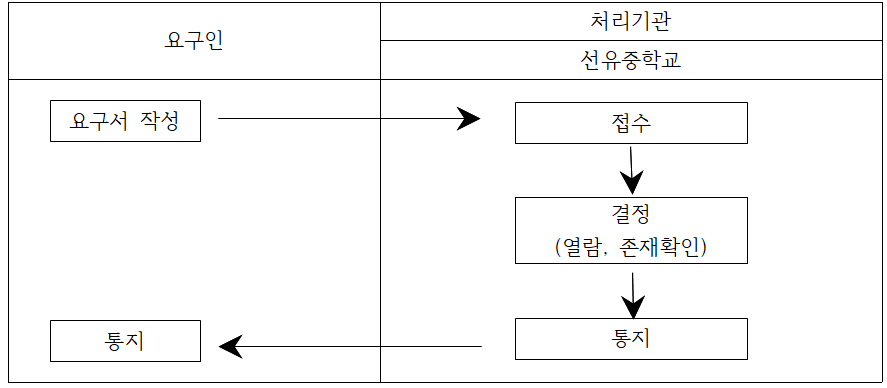 선유중학교는 정보주체가 개인영상정보의 열람 또는 존재확인 요구를 할 경우 10일 이내에 이용자에게 조치 결과를 통지합니다. 개인영상정보의 열람 또는 존재확인 요구는 개인영상정보처리기기 운영 부서를 통하여 가능하며 처리 절차는 다음과 같습니다.